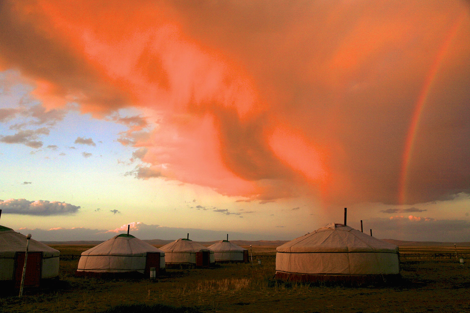 Die Mongolei ist ungefähr 4,5 mal größer als Deutschland. Sie ist gemessen an ihrer Fläche nicht übermäßig mit herausragenden Naturschönheiten gesegnet - die wenigen sind aber dafür um so eindrucksvoller. Zu ihnen zählen ganz bestimmt die rund geschliffenen Felsformationen um Elsen Tasarchai, wo man zudem sehr schön erkennen kann, wie Gebirge, Steppe und Halbwüste fließend ineinander übergehen. Ebenso die "Flaming Cliffs", eine Art Steilküste im Trockenen aus rotorangenem Sandstein. Bereits mehrfach machte die imposante Wand als Fundort prähistorischer Knochen weltweit Schlagzeilen.
